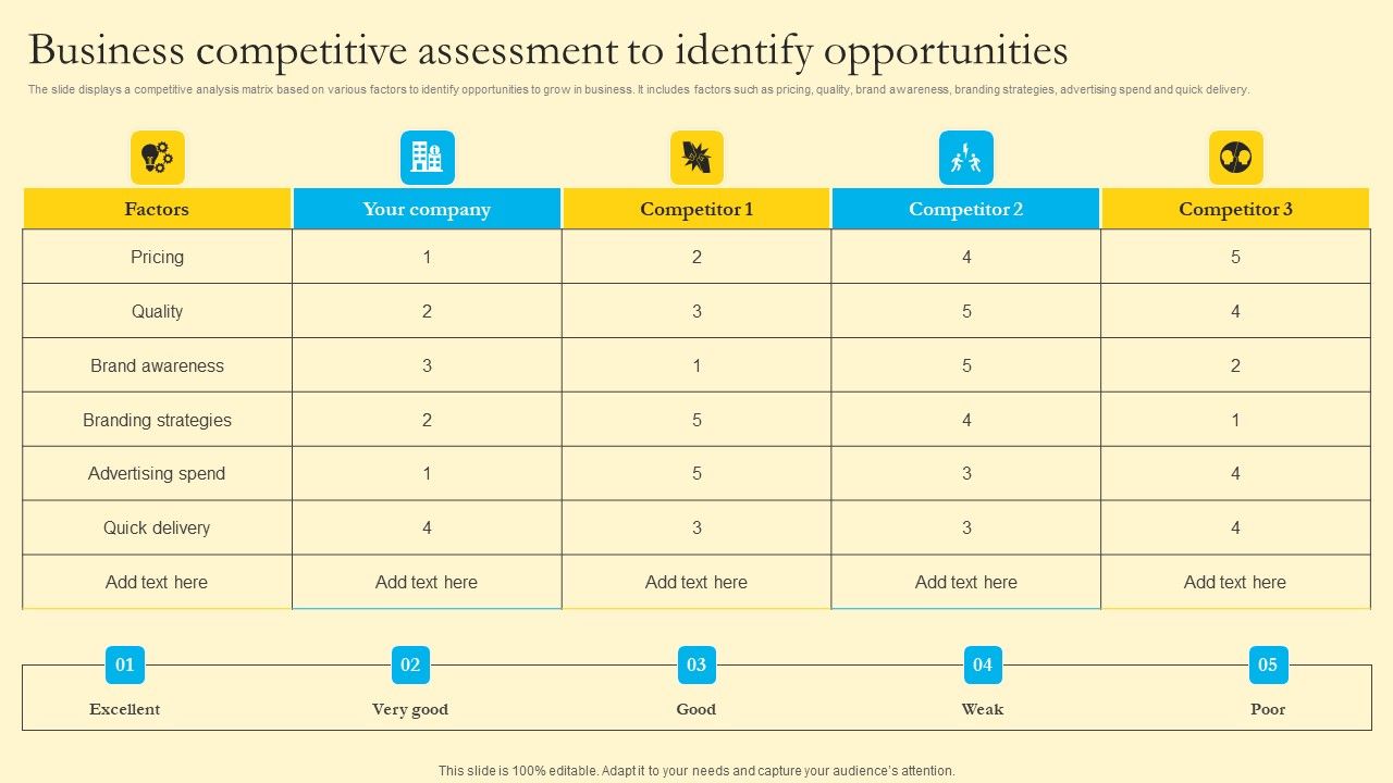 The slide displays a competitive analysis matrix based on various factors to identify opportunities to grow in business. It includes factors such as pricing, quality, brand awareness, branding strategies, advertising spend and quick delivery. Are you searching for a Comprehensive Guide For Sales And Advertising Processes Business Competitive Assessment Identify Opportunities Guidelines PDF that is uncluttered, straightforward, and original Its easy to edit, and you can change the colors to suit your personal or business branding. For a presentation that expresses how much effort you have put in, this template is ideal With all of its features, including tables, diagrams, statistics, and lists, its perfect for a business plan presentation. Make your ideas more appealing with these professional slides. Download Comprehensive Guide For Sales And Advertising Processes Business Competitive Assessment Identify Opportunities Guidelines PDF from Slidegeeks today.