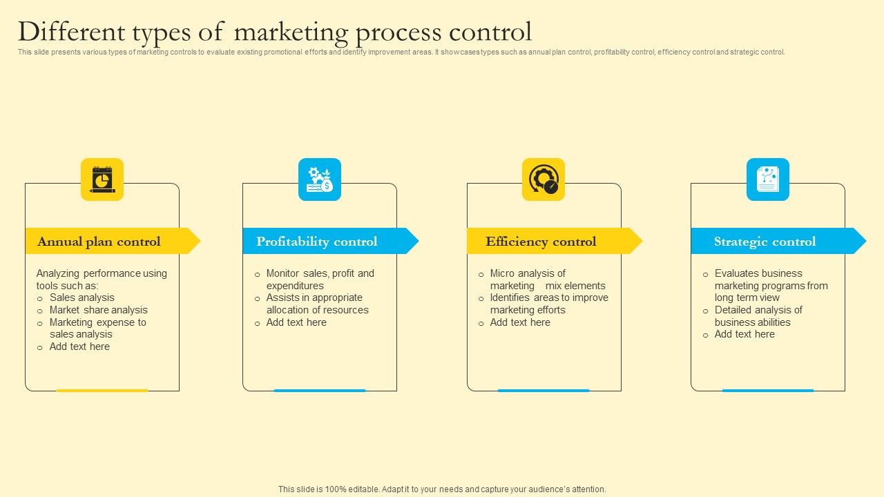 This slide presents various types of marketing controls to evaluate existing promotional efforts and identify improvement areas. It showcases types such as annual plan control, profitability control, efficiency control and strategic control. Here you can discover an assortment of the finest PowerPoint and Google Slides templates. With these templates, you can create presentations for a variety of purposes while simultaneously providing your audience with an eye-catching visual experience. Download Comprehensive Guide For Sales And Advertising Processes Different Types Of Marketing Process Control Template PDF to deliver an impeccable presentation. These templates will make your job of preparing presentations much quicker, yet still, maintain a high level of quality. Slidegeeks has experienced researchers who prepare these templates and write high-quality content for you. Later on, you can personalize the content by editing the Comprehensive Guide For Sales And Advertising Processes Different Types Of Marketing Process Control Template PDF.