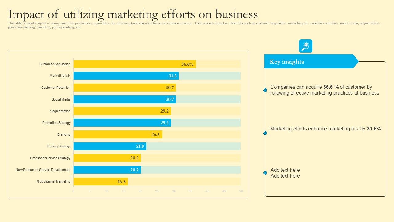 This slide presents impact of using marketing practices in organization for achieving business objectives and increase revenue. It showcases impact on elements such as customer acquisition, marketing mix, customer retention, social media, segmentation, promotion strategy, branding, pricing strategy, etc. Do you know about Slidesgeeks Comprehensive Guide For Sales And Advertising Processes Impact Of Utilizing Marketing Efforts On Business Professional PDF These are perfect for delivering any kind od presentation. Using it, create PowerPoint presentations that communicate your ideas and engage audiences. Save time and effort by using our pre-designed presentation templates that are perfect for a wide range of topic. Our vast selection of designs covers a range of styles, from creative to business, and are all highly customizable and easy to edit. Download as a PowerPoint template or use them as Google Slides themes.