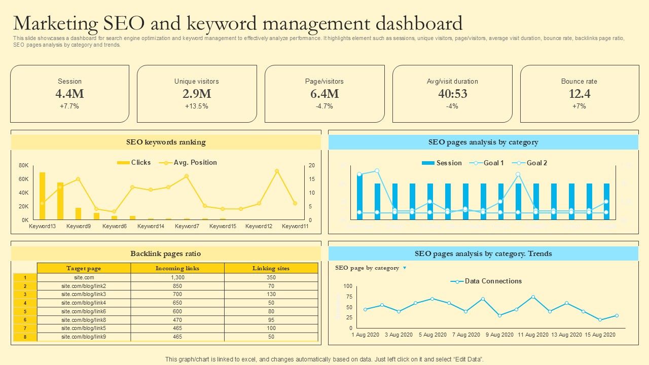 This slide showcases a dashboard for search engine optimization and keyword management to effectively analyze performance. It highlights element such as sessions, unique visitors, page visitors, average visit duration, bounce rate, backlinks page ratio, SEO pages analysis by category and trends. Are you in need of a template that can accommodate all of your creative concepts This one is crafted professionally and can be altered to fit any style. Use it with Google Slides or PowerPoint. Include striking photographs, symbols, depictions, and other visuals. Fill, move around, or remove text boxes as desired. Test out color palettes and font mixtures. Edit and save your work, or work with colleagues. Download Comprehensive Guide For Sales And Advertising Processes Marketing SEO And Keyword Management Dashboard Pictures PDF and observe how to make your presentation outstanding. Give an impeccable presentation to your group and make your presentation unforgettable.