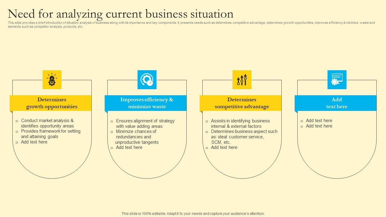 This slide provides a brief introduction of situation analysis of business along with its importance and key components. It presents needs such as determines competitive advantage, determines growth opportunities, improves efficiency and minimize waste and elements such as competitor analysis, products, etc. Make sure to capture your audiences attention in your business displays with our gratis customizable Comprehensive Guide For Sales And Advertising Processes Need For Analyzing Current Business Situation Slides PDF. These are great for business strategies, office conferences, capital raising or task suggestions. If you desire to acquire more customers for your tech business and ensure they stay satisfied, create your own sales presentation with these plain slides.