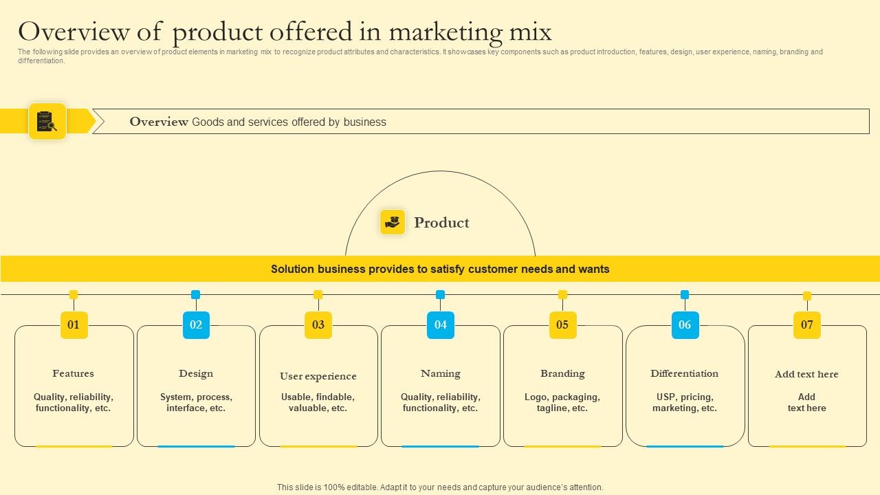 The following slide provides an overview of product elements in marketing mix to recognize product attributes and characteristics. It showcases key components such as product introduction, features, design, user experience, naming, branding and differentiation. Explore a selection of the finest Comprehensive Guide For Sales And Advertising Processes Overview Of Product Offered In Marketing Mix Clipart PDF here. With a plethora of professionally designed and pre-made slide templates, you can quickly and easily find the right one for your upcoming presentation. You can use our Comprehensive Guide For Sales And Advertising Processes Overview Of Product Offered In Marketing Mix Clipart PDF to effectively convey your message to a wider audience. Slidegeeks has done a lot of research before preparing these presentation templates. The content can be personalized and the slides are highly editable. Grab templates today from Slidegeeks.