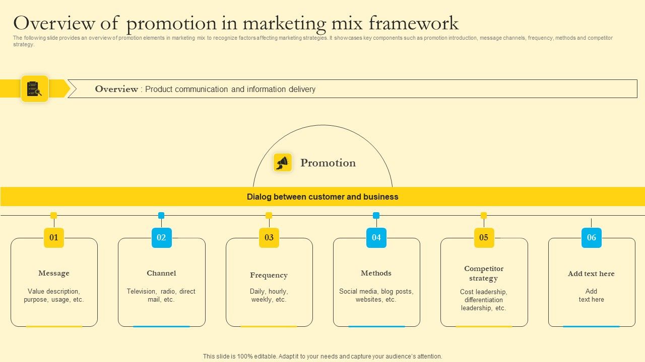 The following slide provides an overview of promotion elements in marketing mix to recognize factors affecting marketing strategies. It showcases key components such as promotion introduction, message channels, frequency, methods and competitor strategy. The best PPT templates are a great way to save time, energy, and resources. Slidegeeks have 100 percent editable powerpoint slides making them incredibly versatile. With these quality presentation templates, you can create a captivating and memorable presentation by combining visually appealing slides and effectively communicating your message. Download Comprehensive Guide For Sales And Advertising Processes Overview Of Promotion In Marketing Mix Framework Template PDF from Slidegeeks and deliver a wonderful presentation.