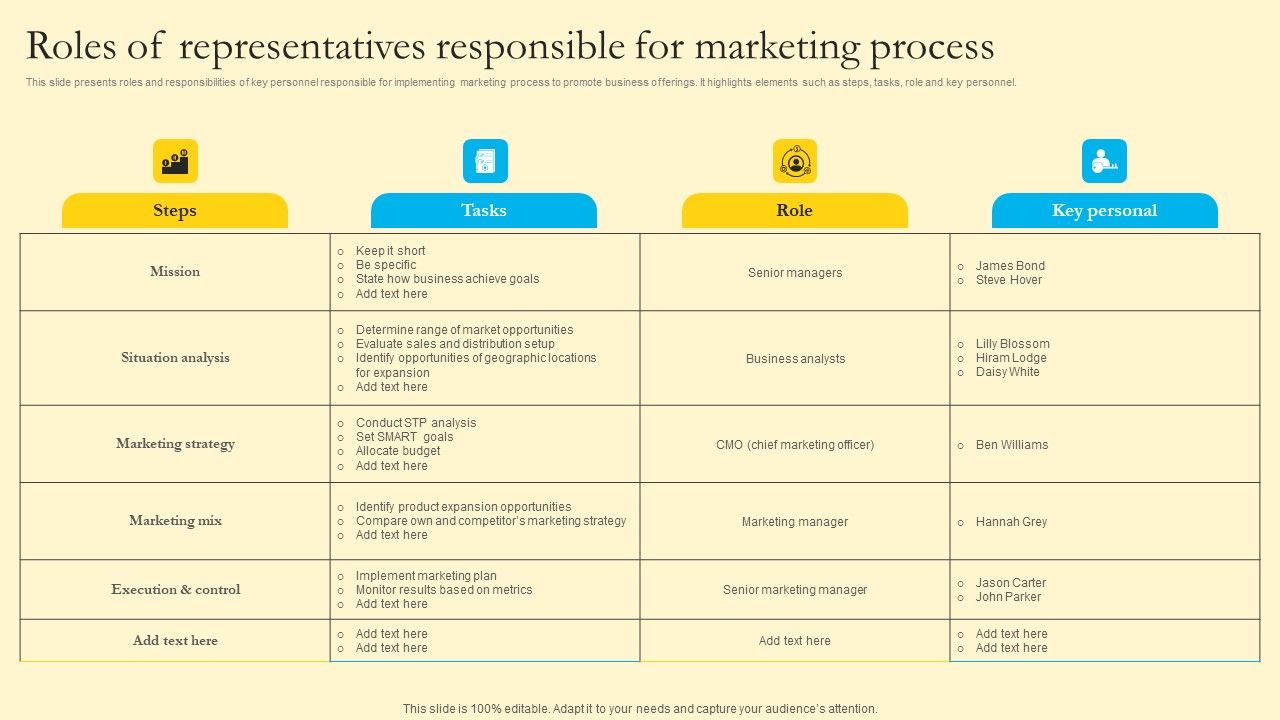 This slide presents roles and responsibilities of key personnel responsible for implementing marketing process to promote business offerings. It highlights elements such as steps, tasks, role and key personnel. Are you searching for a Comprehensive Guide For Sales And Advertising Processes Roles Of Representatives Responsible For Marketing Process Inspiration PDF that is uncluttered, straightforward, and original Its easy to edit, and you can change the colors to suit your personal or business branding. For a presentation that expresses how much effort you have put in, this template is ideal With all of its features, including tables, diagrams, statistics, and lists, its perfect for a business plan presentation. Make your ideas more appealing with these professional slides. Download Comprehensive Guide For Sales And Advertising Processes Roles Of Representatives Responsible For Marketing Process Inspiration PDF from Slidegeeks today.