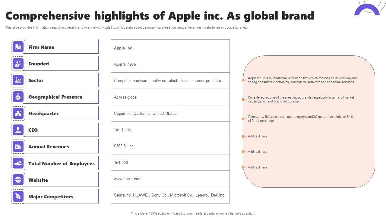 This slide provides information regarding overall brand overview of Apple Inc. with details about geographical presence, annual revenues, website, major competitors, etc. This Comprehensive Highlights Of Apple Inc As Global Brand Ppt Styles Portfolio PDF from Slidegeeks makes it easy to present information on your topic with precision. It provides customization options, so you can make changes to the colors, design, graphics, or any other component to create a unique layout. It is also available for immediate download, so you can begin using it right away. Slidegeeks has done good research to ensure that you have everything you need to make your presentation stand out. Make a name out there for a brilliant performance.