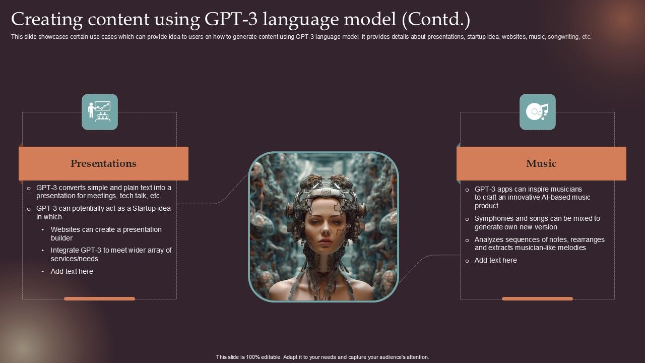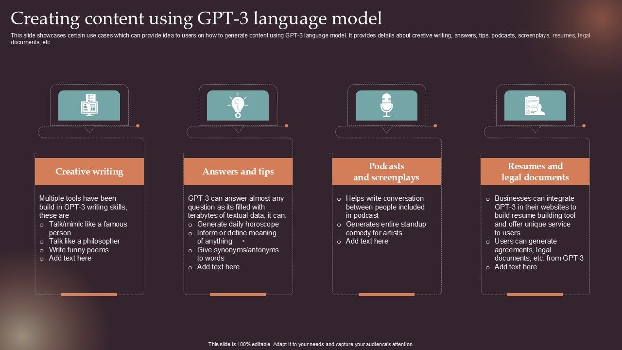 This slide showcases certain use cases which can provide idea to users on how to generate content using GPT-3 language model. It provides details about creative writing, answers, tips, podcasts, screenplays, resumes, legal documents, etc. Want to ace your presentation in front of a live audience Our Comprehensive Resource Guide To Master GPT 3 Creating Content Using GPT 3 Language Model Summary PDF can help you do that by engaging all the users towards you. Slidegeeks experts have put their efforts and expertise into creating these impeccable powerpoint presentations so that you can communicate your ideas clearly. Moreover, all the templates are customizable, and easy to edit and downloadable. Use these for both personal and commercial use.