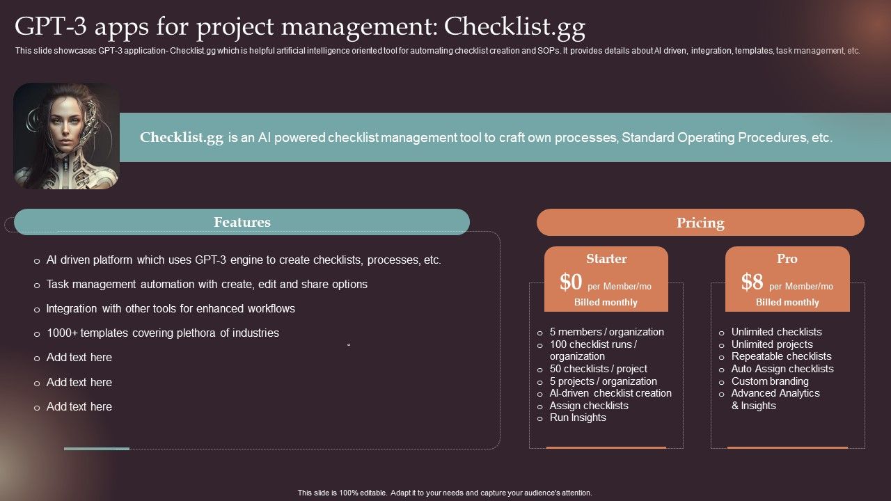 This slide showcases GPT-3 application- Checklist.gg which is helpful artificial intelligence oriented tool for automating checklist creation and SOPs. It provides details about AI driven, integration, templates, task management, etc. If your project calls for a presentation, then Slidegeeks is your go to partner because we have professionally designed, easy to edit templates that are perfect for any presentation. After downloading, you can easily edit Comprehensive Resource Guide To Master GPT 3 GPT 3 Apps For Project Management Checklist Gg Structure PDF and make the changes accordingly. You can rearrange slides or fill them with different images. Check out all the handy templates