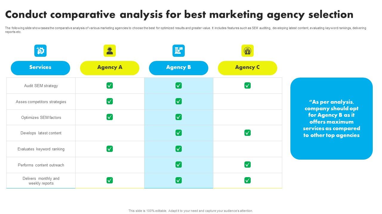 The following slide showcases the comparative analysis of various marketing agencies to choose the best for optimized results and greater value. It includes features such as SEM auditing, developing latest content, evaluating keyword rankings, delivering reports etc. Boost your pitch with our creative Conduct Comparative Analysis For Best Marketing Agency Selection Portrait PDF. Deliver an awe inspiring pitch that will mesmerize everyone. Using these presentation templates you will surely catch everyones attention. You can browse the ppts collection on our website. We have researchers who are experts at creating the right content for the templates. So you do not have to invest time in any additional work. Just grab the template now and use them.
