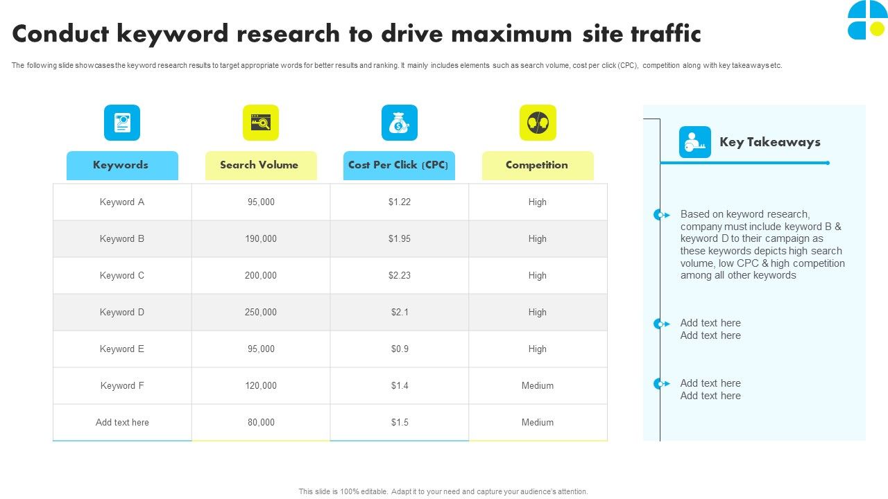The following slide showcases the keyword research results to target appropriate words for better results and ranking. It mainly includes elements such as search volume, cost per click CPC, competition along with key takeaways etc. Create an editable Conduct Keyword Research To Drive Maximum Site Traffic Topics PDF that communicates your idea and engages your audience. Whether you are presenting a business or an educational presentation, pre designed presentation templates help save time. Conduct Keyword Research To Drive Maximum Site Traffic Topics PDF is highly customizable and very easy to edit, covering many different styles from creative to business presentations. Slidegeeks has creative team members who have crafted amazing templates. So, go and get them without any delay.
