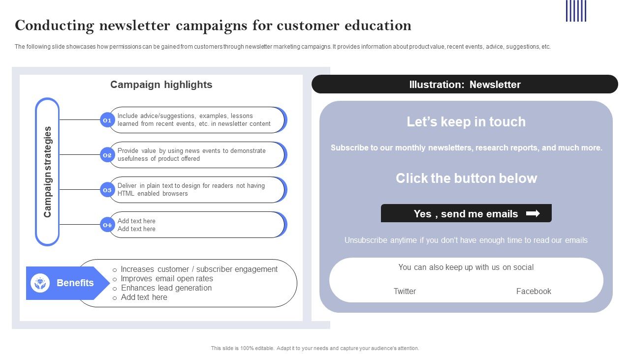 The following slide showcases how permissions can be gained from customers through newsletter marketing campaigns. It provides information about product value, recent events, advice, suggestions, etc. Slidegeeks is one of the best resources for PowerPoint templates. You can download easily and regulate Conducting Newsletter Campaigns For Customer Education Professional PDF for your personal presentations from our wonderful collection. A few clicks is all it takes to discover and get the most relevant and appropriate templates. Use our Templates to add a unique zing and appeal to your presentation and meetings. All the slides are easy to edit and you can use them even for advertisement purposes.