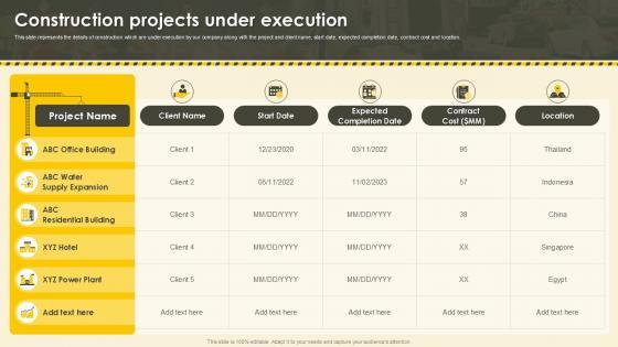 Get a simple yet stunning designed Construction Company Profile Construction Projects Under Execution. It is the best one to establish the tone in your meetings. It is an excellent way to make your presentations highly effective. So, download this PPT today from Slidegeeks and see the positive impacts. Our easy-to-edit Construction Company Profile Construction Projects Under Execution can be your go-to option for all upcoming conferences and meetings. So, what are you waiting for Grab this template today.