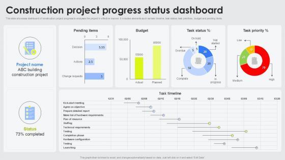 Create an editable Construction Project Progress Status Dashboard that communicates your idea and engages your audience. Whether you are presenting a business or an educational presentation, pre-designed presentation templates help save time. Construction Project Progress Status Dashboard is highly customizable and very easy to edit, covering many different styles from creative to business presentations. Slidegeeks has creative team members who have crafted amazing templates. So, go and get them without any delay.