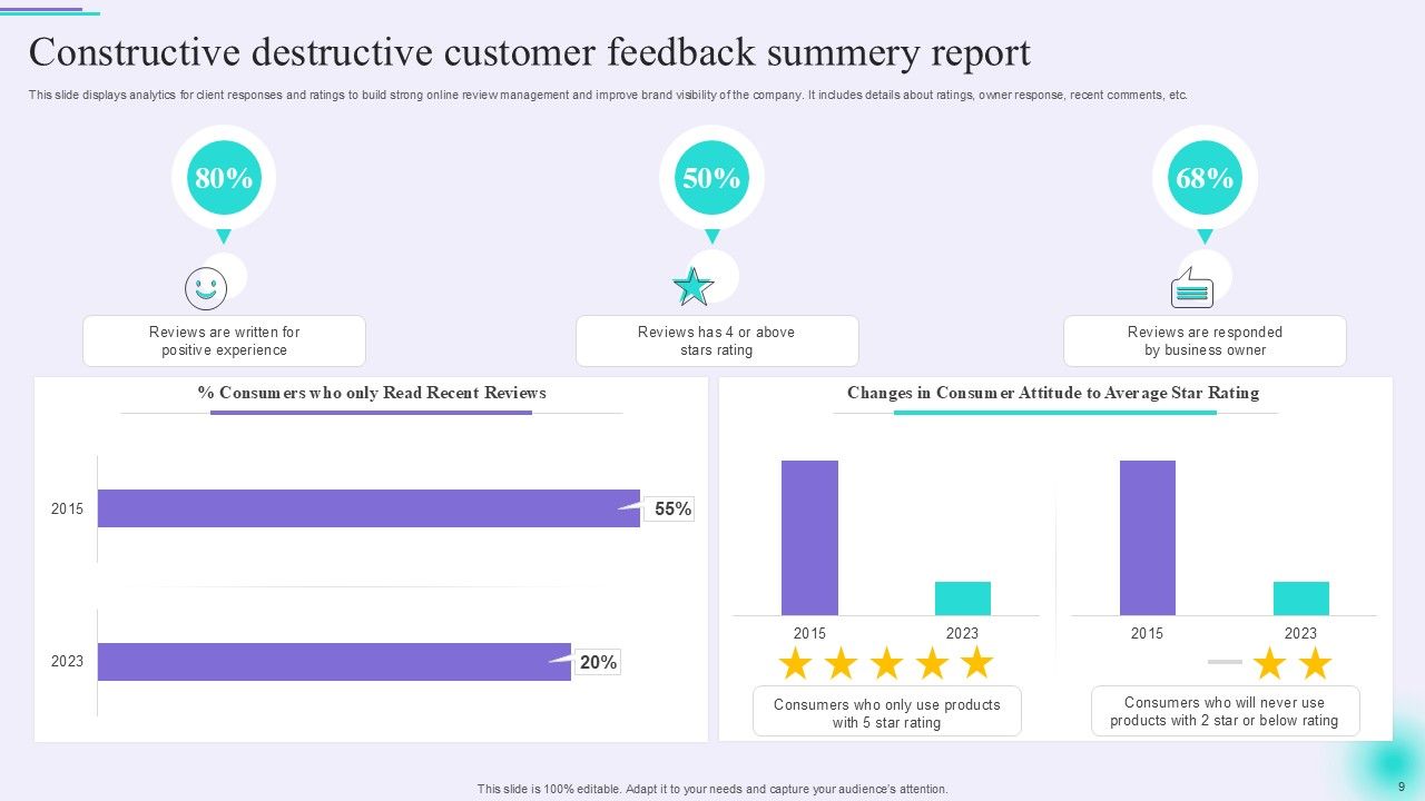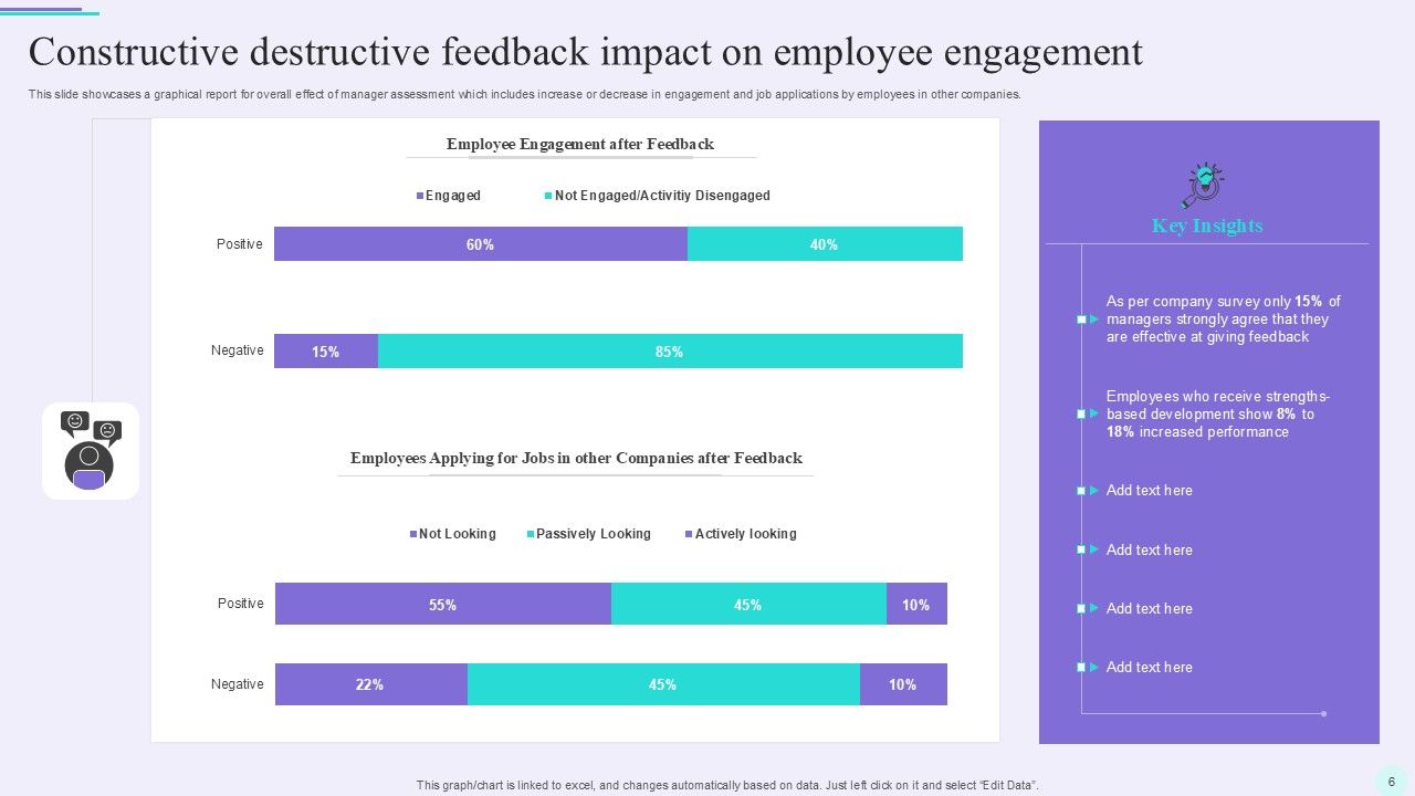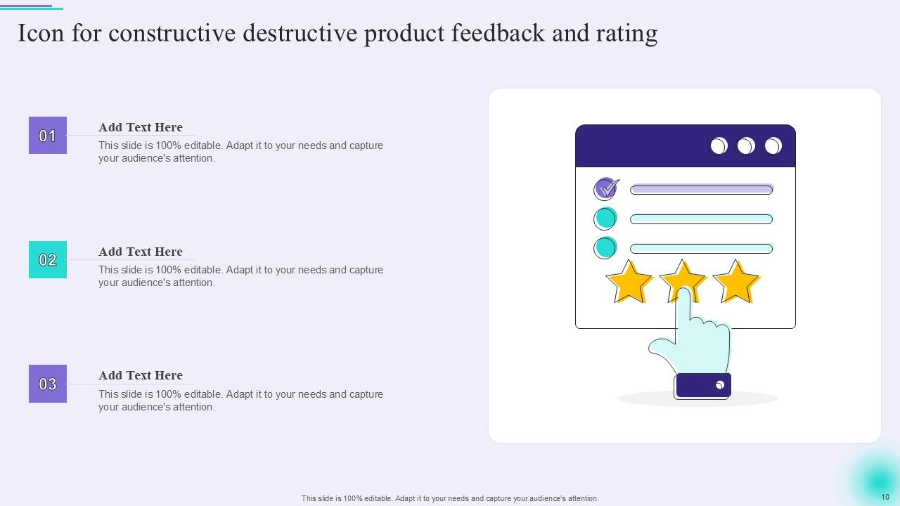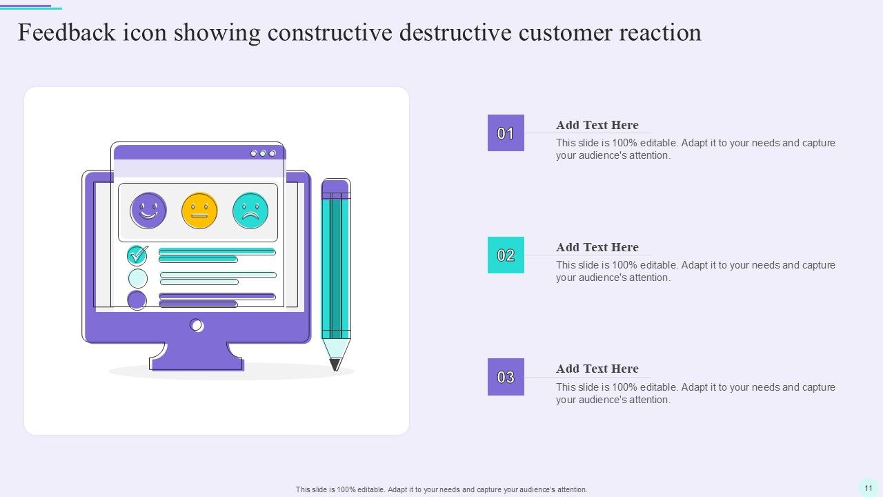 Improve your presentation delivery using this Constructive Destructive Feedback Ppt PowerPoint Presentation Complete Deck With Slides. Support your business vision and objectives using this well-structured PPT deck. This template offers a great starting point for delivering beautifully designed presentations on the topic of your choice. Comprising twelve this professionally designed template is all you need to host discussion and meetings with collaborators. Each slide is self-explanatory and equipped with high-quality graphics that can be adjusted to your needs. Therefore, you will face no difficulty in portraying your desired content using this PPT slideshow. This PowerPoint slideshow contains every important element that you need for a great pitch. It is not only editable but also available for immediate download and utilization. The color, font size, background, shapes everything can be modified to create your unique presentation layout. Therefore, download it now.