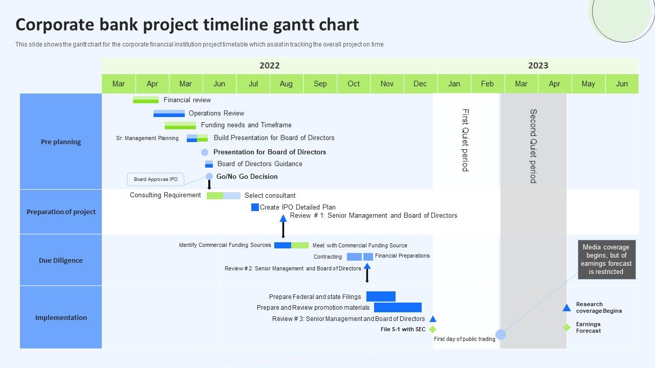 This slide shows the gantt chart for the corporate financial institution project timetable which assist in tracking the overall project on time Showcasing this set of slides titled Corporate Bank Project Timeline Gantt Chart Infographics PDF. The topics addressed in these templates are Chart, Corporate, Project. All the content presented in this PPT design is completely editable. Download it and make adjustments in color, background, font etc. as per your unique business setting.