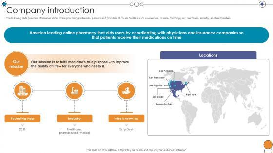 The following slide provides information about online pharmacy platform for patients and providers. It covers facilities such as overview, mission, founding year, customers, industry, and headquarters. Retrieve professionally designed Company Introduction Digital Pharmacy Company Investor Funding Ppt Powerpoint to effectively convey your message and captivate your listeners. Save time by selecting pre-made slideshows that are appropriate for various topics, from business to educational purposes. These themes come in many different styles, from creative to corporate, and all of them are easily adjustable and can be edited quickly. Access them as PowerPoint templates or as Google Slides themes. You do not have to go on a hunt for the perfect presentation because Slidegeeks got you covered from everywhere.