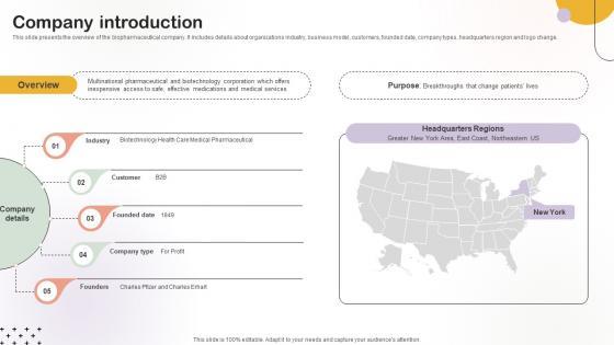 This slide presents the overview of the biopharmaceutical company. It includes details about organizations industry, business model, customers, founded date, company types, headquarters region and logo change.Slidegeeks is one of the best resources for PowerPoint templates. You can download easily and regulate Company Introduction Medical Research Organization Pitch Deck for your personal presentations from our wonderful collection. A few clicks is all it takes to discover and get the most relevant and appropriate templates. Use our Templates to add a unique zing and appeal to your presentation and meetings. All the slides are easy to edit and you can use them even for advertisement purposes.