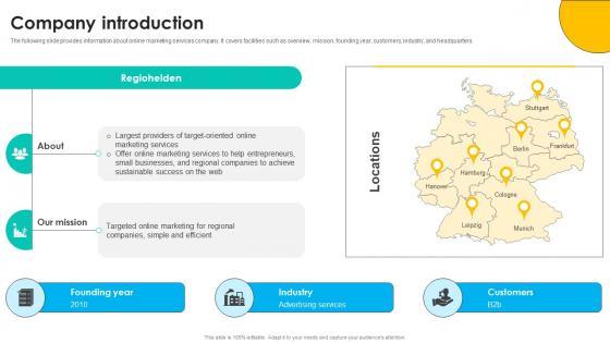 The following slide provides information about online marketing services company. It covers facilities such as overview, mission, founding year, customers, industry, and headquarters. Slidegeeks is one of the best resources for PowerPoint templates. You can download easily and regulate Company Introduction Online Marketing Solutions Pitch Deck for your personal presentations from our wonderful collection. A few clicks is all it takes to discover and get the most relevant and appropriate templates. Use our Templates to add a unique zing and appeal to your presentation and meetings. All the slides are easy to edit and you can use them even for advertisement purposes.