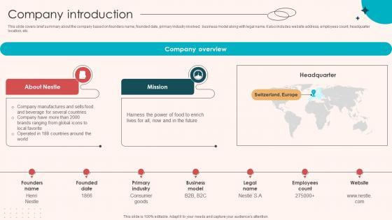 This slide covers brief summary about the company based on founders name, founded date, primary industry involved, business model along with legal name. it also includes website address, employees count, headquarter location, etc. Slidegeeks is one of the best resources for PowerPoint templates. You can download easily and regulate Company Introduction Retail Merchandising Company Investor Funding Elevator Pitch Deck Ppt Sample for your personal presentations from our wonderful collection. A few clicks is all it takes to discover and get the most relevant and appropriate templates. Use our Templates to add a unique zing and appeal to your presentation and meetings. All the slides are easy to edit and you can use them even for advertisement purposes.