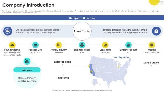 This slide covers brief summary of the company based on information related to founders name and date. The purpose of this template is to provide an overview on definition of the company, primary industry, business model, legal name, headquarter location, industries catered, etc. Slidegeeks is one of the best resources for PowerPoint templates. You can download easily and regulate Company Introduction Web Based Automated Tool Platform Pitch Deck Ppt Slides for your personal presentations from our wonderful collection. A few clicks is all it takes to discover and get the most relevant and appropriate templates. Use our Templates to add a unique zing and appeal to your presentation and meetings. All the slides are easy to edit and you can use them even for advertisement purposes.