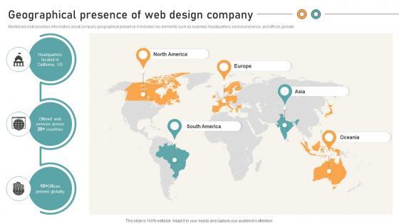Mentioned slide provides information about company geographical presence. It includes key elements such as business headquarters, service presence, and offices globally. Do you know about Slidesgeeks Comprehensive Guide For Website Geographical Presence Of Web Design Company These are perfect for delivering any kind od presentation. Using it, create PowerPoint presentations that communicate your ideas and engage audiences. Save time and effort by using our pre-designed presentation templates that are perfect for a wide range of topic. Our vast selection of designs covers a range of styles, from creative to business, and are all highly customizable and easy to edit. Download as a PowerPoint template or use them as Google Slides themes.