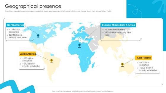 This slide represents Coca-Cola global presence which covers regions such as North America, Latin America, Europe, Middle East, Africa and Asia Pacific. This Geographical Presence Beverage Manufacturer Company Profile Ppt Slides CP SS V from Slidegeeks makes it easy to present information on your topic with precision. It provides customization options, so you can make changes to the colors, design, graphics, or any other component to create a unique layout. It is also available for immediate download, so you can begin using it right away. Slidegeeks has done good research to ensure that you have everything you need to make your presentation stand out. Make a name out there for a brilliant performance.