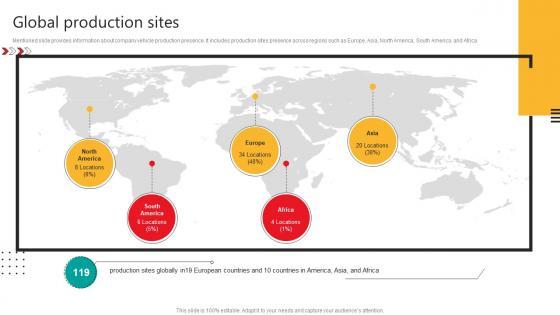 Mentioned slide provides information about company vehicle production presence. It includes production sites presence across regions such as Europe, Asia, North America, South America, and Africa. Make sure to capture your audiences attention in your business displays with our gratis customizable Global Production Sites Automobile Development Company Profile CP SS V. These are great for business strategies, office conferences, capital raising or task suggestions. If you desire to acquire more customers for your tech business and ensure they stay satisfied, create your own sales presentation with these plain slides.