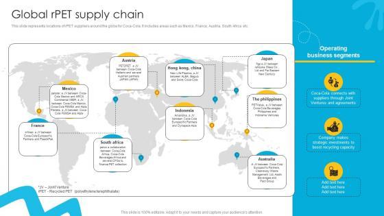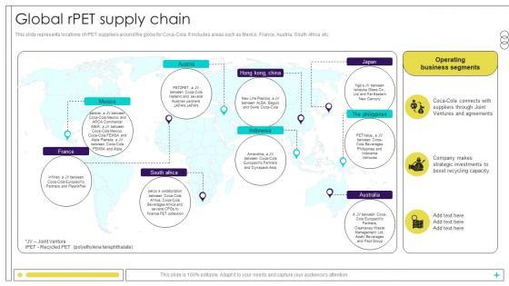This slide represents locations of rPET suppliers around the globe for Coca-Cola. It includes areas such as Mexico, France, Austria, South Africa etc. Want to ace your presentation in front of a live audience Our Global RPET Supply Chain Beverage Manufacturer Company Profile Ppt Powerpoint CP SS V can help you do that by engaging all the users towards you. Slidegeeks experts have put their efforts and expertise into creating these impeccable powerpoint presentations so that you can communicate your ideas clearly. Moreover, all the templates are customizable, and easy-to-edit and downloadable. Use these for both personal and commercial use.