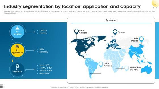 The slide showcases the wind energy industry segmentation based on attributes such as location, application, capacity, and region. This slide aims to identify, analyze and categorize the market to serve clients demands and meet their expectations. Are you in need of a template that can accommodate all of your creative concepts This one is crafted professionally and can be altered to fit any style. Use it with Google Slides or PowerPoint. Include striking photographs, symbols, depictions, and other visuals. Fill, move around, or remove text boxes as desired. Test out color palettes and font mixtures. Edit and save your work, or work with colleagues. Download Industry Segmentation By Location Global Wind Power Market PPT Presentation IR SS V and observe how to make your presentation outstanding. Give an impeccable presentation to your group and make your presentation unforgettable.