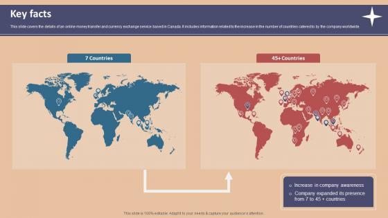 This slide covers the details of an online money transfer and currency exchange service based in Canada. It includes information related to the increase in the number of countries catered to by the company worldwide. If your project calls for a presentation, then Slidegeeks is your go-to partner because we have professionally designed, easy-to-edit templates that are perfect for any presentation. After downloading, you can easily edit Key Facts Foreign Exchange Company Investor Funding Elevator Pitch Deck and make the changes accordingly. You can rearrange slides or fill them with different images. Check out all the handy templates