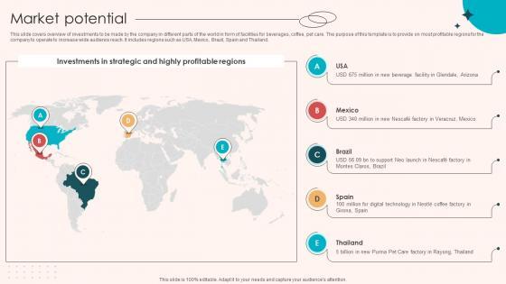 This slide covers overview of investments to be made by the company in different parts of the world in form of facilities for beverages, coffee, pet care. The purpose of this template is to provide on most profitable regions for the company to operate to increase wide audience reach. It includes regions such as USA, Mexico, Brazil, Spain and Thailand. Are you in need of a template that can accommodate all of your creative concepts This one is crafted professionally and can be altered to fit any style. Use it with Google Slides or PowerPoint. Include striking photographs, symbols, depictions, and other visuals. Fill, move around, or remove text boxes as desired. Test out color palettes and font mixtures. Edit and save your work, or work with colleagues. Download Market Potential Retail Merchandising Company Investor Funding Elevator Pitch Deck Ppt Template and observe how to make your presentation outstanding. Give an impeccable presentation to your group and make your presentation unforgettable.
