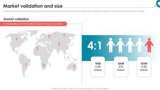 This slide outlines the total available market TAM, serviceable available market SAM, and service obtainable market SOM, quickly showcasing our businesss market potential and the portion we aim to capture. If your project calls for a presentation, then Slidegeeks is your go to partner because we have professionally designed, easy to edit templates that are perfect for any presentation. After downloading, you can easily edit Market Validation And Size Private School Investor Funding Elevator Pitch Deck PPT PowerPoint and make the changes accordingly. You can rearrange slides or fill them with different images. Check out all the handy templates