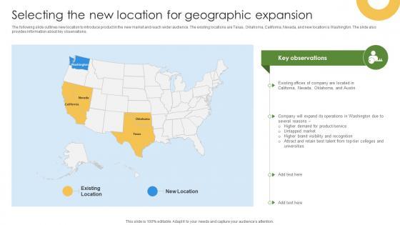 The following slide outlines new location to introduce product in the new market and reach wider audience. The existing locations are Texas, Oklahoma, California, Nevada, and new location is Washington. The slide also provides information about key observations. There are so many reasons you need a Marketing Growth Strategy Selecting The New Location For Geographic Expansion Strategy SS V. The first reason is you can not spend time making everything from scratch, Thus, Slidegeeks has made presentation templates for you too. You can easily download these templates from our website easily.