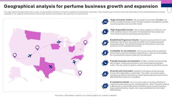 This slide outlines the factors that make a country an ideal location for perfume company to establish and expand their businesses. These include huge consumer market, high disposable income, established fragrance industry, availability to raw material, friendly business environment, diversity and innovation, and, growing e-commerce market. Find highly impressive Perfume Manufacturing Business Plan Geographical Analysis For Perfume Business Growth BP SS V on Slidegeeks to deliver a meaningful presentation. You can save an ample amount of time using these presentation templates. No need to worry to prepare everything from scratch because Slidegeeks experts have already done a huge research and work for you. You need to download Perfume Manufacturing Business Plan Geographical Analysis For Perfume Business Growth BP SS V for your upcoming presentation. All the presentation templates are 100 percent editable and you can change the color and personalize the content accordingly. Download now