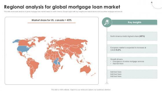 This slide showcases analysis of global mortgage loan market based on north America, Europe region with key insights and market drivers such as online mortgage services etc. Coming up with a presentation necessitates that the majority of the effort goes into the content and the message you intend to convey. The visuals of a PowerPoint presentation can only be effective if it supplements and supports the story that is being told. Keeping this in mind our experts created Regional Analysis For Global Mortgage Loan Market Ppt PowerPoint CRP DK SS V to reduce the time that goes into designing the presentation. This way, you can concentrate on the message while our designers take care of providing you with the right template for the situation.