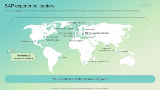 Following slide highlights experience centers located across global. It includes experience centers in countries such as India, Germany, Spain, Belgium, Denmark, South Africa, France, the USA, Brazil, etc.Whether you have daily or monthly meetings, a brilliant presentation is necessary. Sap Experience Centers Enterprise Software Solution Providing Company Profile CP SS V can be your best option for delivering a presentation. Represent everything in detail using Sap Experience Centers Enterprise Software Solution Providing Company Profile CP SS V and make yourself stand out in meetings. The template is versatile and follows a structure that will cater to your requirements. All the templates prepared by Slidegeeks are easy to download and edit. Our research experts have taken care of the corporate themes as well. So, give it a try and see the results.