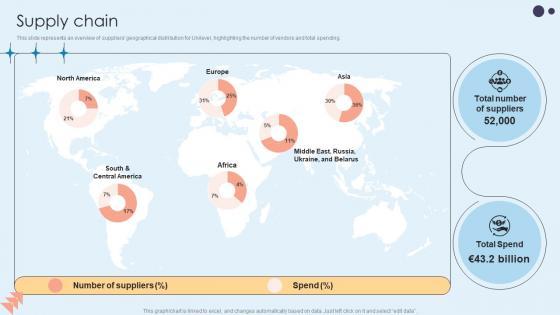This slide represents an overview of suppliers geographical distribution for Unilever, highlighting the number of vendors and total spending.Take your projects to the next level with our ultimate collection of Supply Chain Home Care Solutions Company Profile CP SS V. Slidegeeks has designed a range of layouts that are perfect for representing task or activity duration, keeping track of all your deadlines at a glance. Tailor these designs to your exact needs and give them a truly corporate look with your own brand colors they will make your projects stand out from the rest