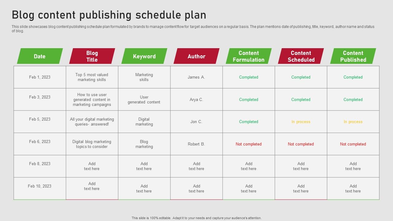 This slide showcases blog content publishing schedule plan formulated by brands to manage content flow for target audiences on a regular basis. The plan mentions date of publishing, title, keyword, author name and status of blog. Boost your pitch with our creative Creating Content Marketing Technique For Brand Promotions Blog Content Publishing Schedule Plan Topics PDF. Deliver an awe-inspiring pitch that will mesmerize everyone. Using these presentation templates you will surely catch everyones attention. You can browse the ppts collection on our website. We have researchers who are experts at creating the right content for the templates. So you do not have to invest time in any additional work. Just grab the template now and use them.