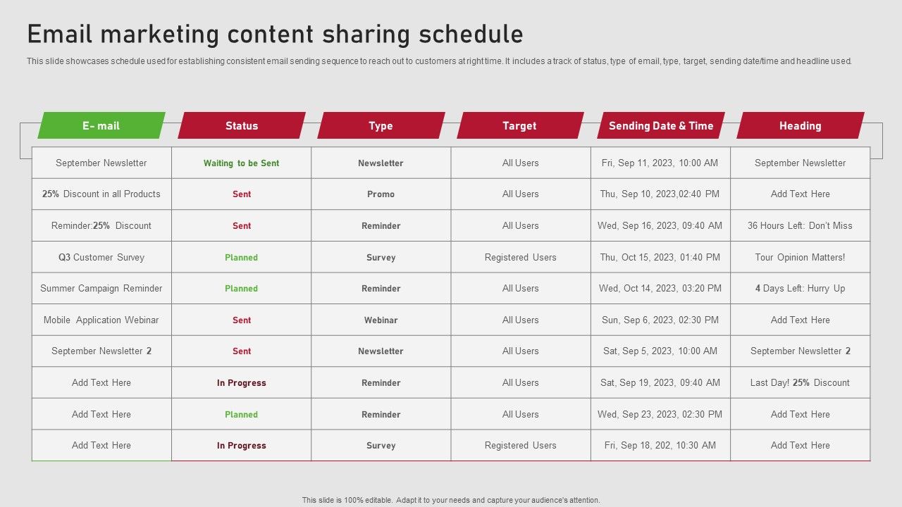 Creating Content Marketing Technique For Brand Promotions Email Marketing Content Sharing Schedule Topics PDF with all 9 slides: