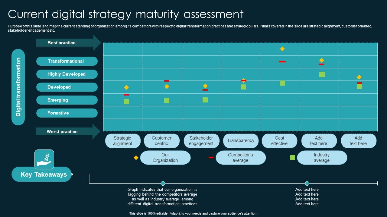 Purpose of this slide is to map the current standing of organization among its competitors with respect to digital transformation practices and strategic pillars. Pillars covered in the slide are strategic alignment, customer oriented, stakeholder engagement etc. Coming up with a presentation necessitates that the majority of the effort goes into the content and the message you intend to convey. The visuals of a PowerPoint presentation can only be effective if it supplements and supports the story that is being told. Keeping this in mind our experts created Current Digital Strategy Maturity Assessment Brochure PDF to reduce the time that goes into designing the presentation. This way, you can concentrate on the message while our designers take care of providing you with the right template for the situation.