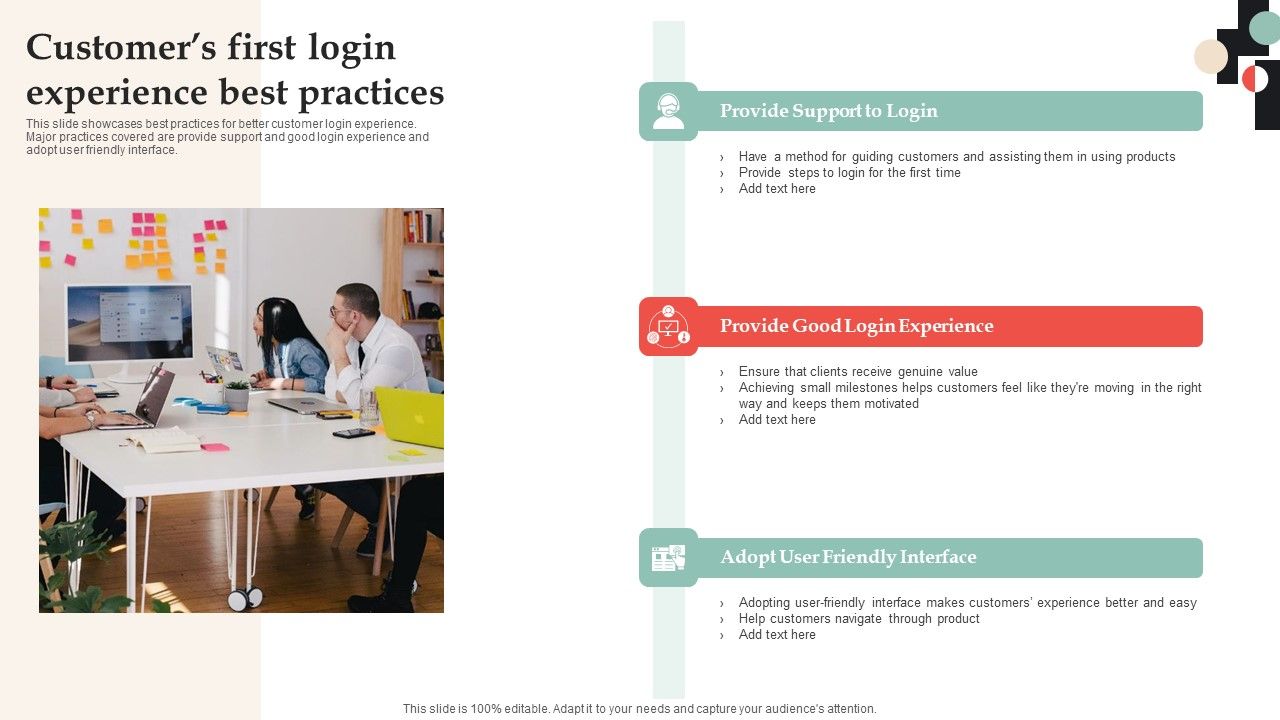 This slide showcases best practices for better customer login experience. Major practices covered are provide support and good login experience and adopt user friendly interface. From laying roadmaps to briefing everything in detail, our templates are perfect for you. You can set the stage with your presentation slides. All you have to do is download these easy to edit and customizable templates. Customer Onboarding Journey Optimization Plan Customers First Login Experience Best Practices Summary PDF will help you deliver an outstanding performance that everyone would remember and praise you for. Do download this presentation today.