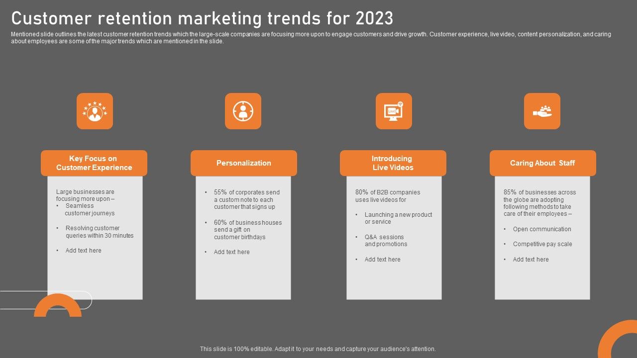 Mentioned slide outlines the latest customer retention trends which the large-scale companies are focusing more upon to engage customers and drive growth. Customer experience, live video, content personalization, and caring about employees are some of the major trends which are mentioned in the slide. Presenting this PowerPoint presentation, titled Customer Retention Marketing Trends For 2023 Information PDF, with topics curated by our researchers after extensive research. This editable presentation is available for immediate download and provides attractive features when used. Download now and captivate your audience. Presenting this Customer Retention Marketing Trends For 2023 Information PDF. Our researchers have carefully researched and created these slides with all aspects taken into consideration. This is a completely customizable Customer Retention Marketing Trends For 2023 Information PDF that is available for immediate downloading. Download now and make an impact on your audience. Highlight the attractive features available with our PPTs.