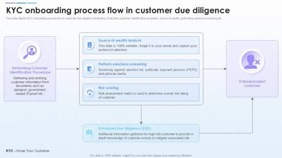 The KYC Onboarding Process Flow In Customer Due Diligence is a compilation of the most recent design trends as a series of slides. It is suitable for any subject or industry presentation, containing attractive visuals and photo spots for businesses to clearly express their messages. This template contains a variety of slides for the user to input data, such as structures to contrast two elements, bullet points, and slides for written information. Slidegeeks is prepared to create an impression.