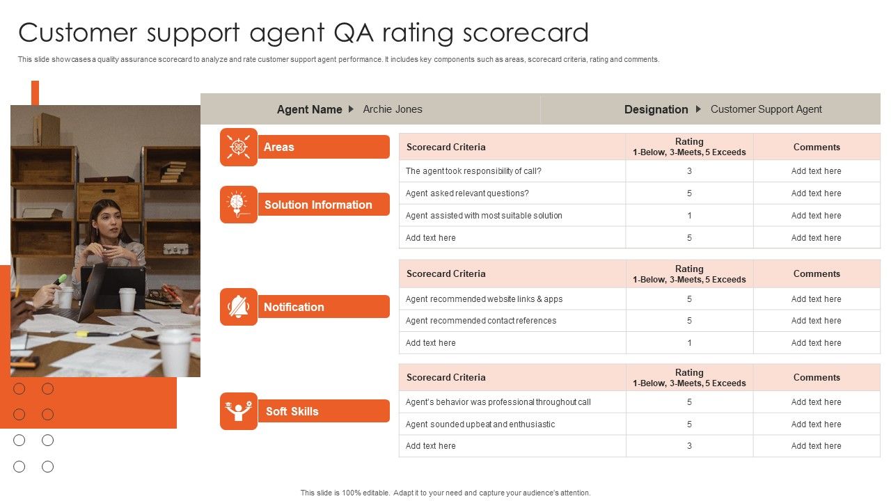 This slide showcases a quality assurance scorecard to analyze and rate customer support agent performance. It includes key components such as areas, scorecard criteria, rating and comments. Persuade your audience using this Customer Support Agent QA Rating Scorecard Portrait PDF. This PPT design covers four stages, thus making it a great tool to use. It also caters to a variety of topics including Customer Support Agent, QA Rating Scorecard. Download this PPT design now to present a convincing pitch that not only emphasizes the topic but also showcases your presentation skills.