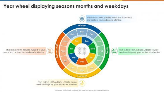 If your project calls for a presentation, then Slidegeeks is your go-to partner because we have professionally designed, easy-to-edit templates that are perfect for any presentation. After downloading, you can easily edit Year Wheel Displaying Seasons Months And Weekdays and make the changes accordingly. You can rearrange slides or fill them with different images. Check out all the handy templates