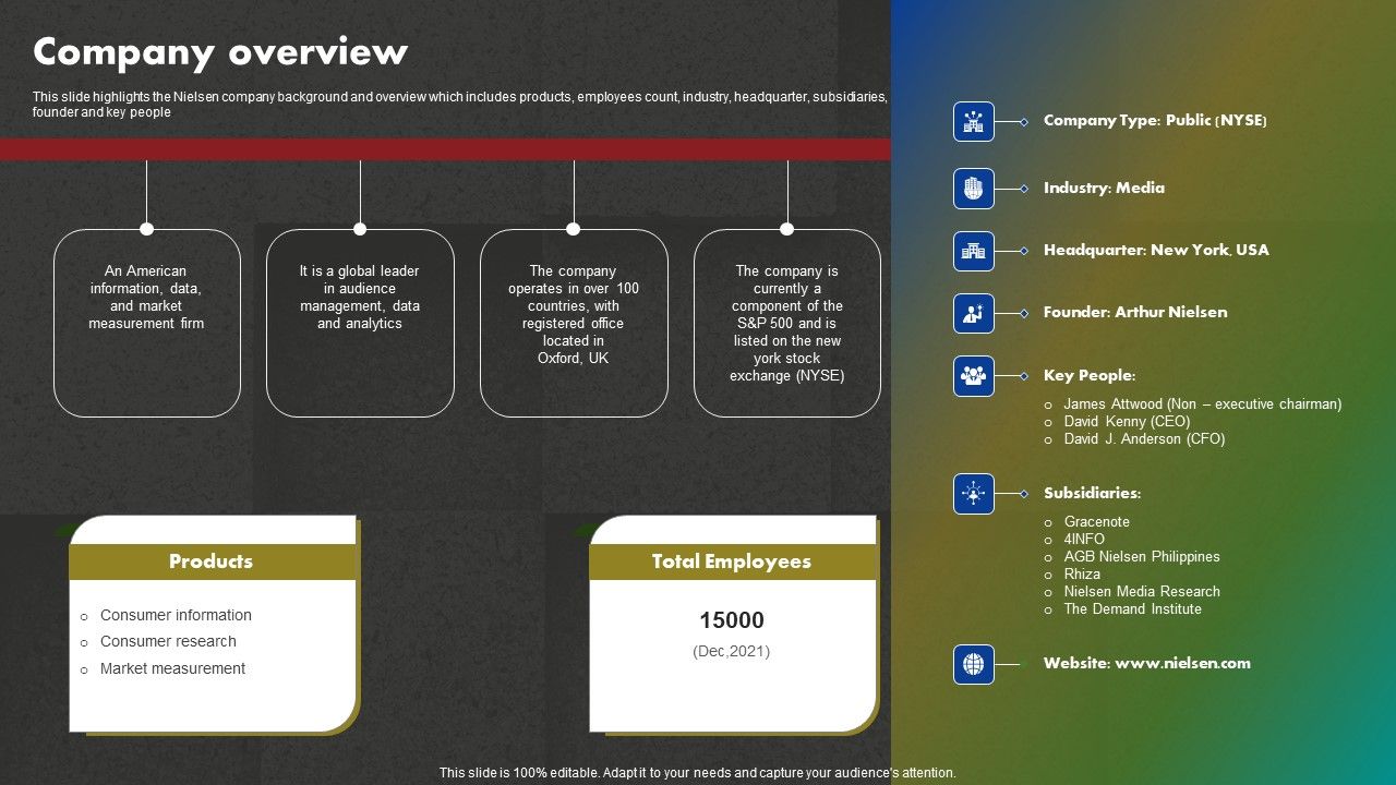 This slide highlights the Nielsen company background and overview which includes products, employees count, industry, headquarter, subsidiaries, founder and key people Create an editable Data And Customer Analysis Company Outline Company Overview Template PDF that communicates your idea and engages your audience. Whether youre presenting a business or an educational presentation, pre designed presentation templates help save time. Data And Customer Analysis Company Outline Company Overview Template PDF is highly customizable and very easy to edit, covering many different styles from creative to business presentations. Slidegeeks has creative team members who have crafted amazing templates. So, go and get them without any delay.