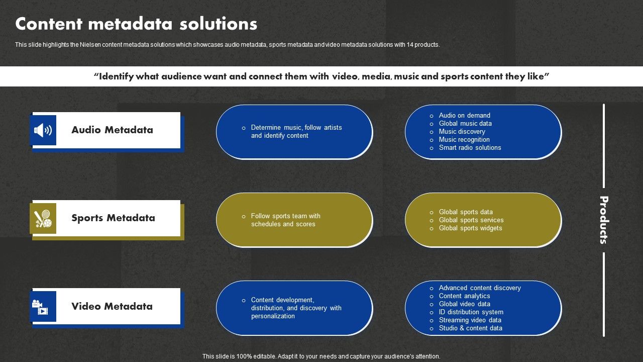 This slide highlights the Nielsen content metadata solutions which showcases audio metadata, sports metadata and video metadata solutions with 14 products. Crafting an eye catching presentation has never been more straightforward. Let your presentation shine with this tasteful yet straightforward Data And Customer Analysis Company Outline Content Metadata Solutions Brochure PDF template. It offers a minimalistic and classy look that is great for making a statement. The colors have been employed intelligently to add a bit of playfulness while still remaining professional. Construct the ideal Data And Customer Analysis Company Outline Content Metadata Solutions Brochure PDF that effortlessly grabs the attention of your audience. Begin now and be certain to wow your customers.