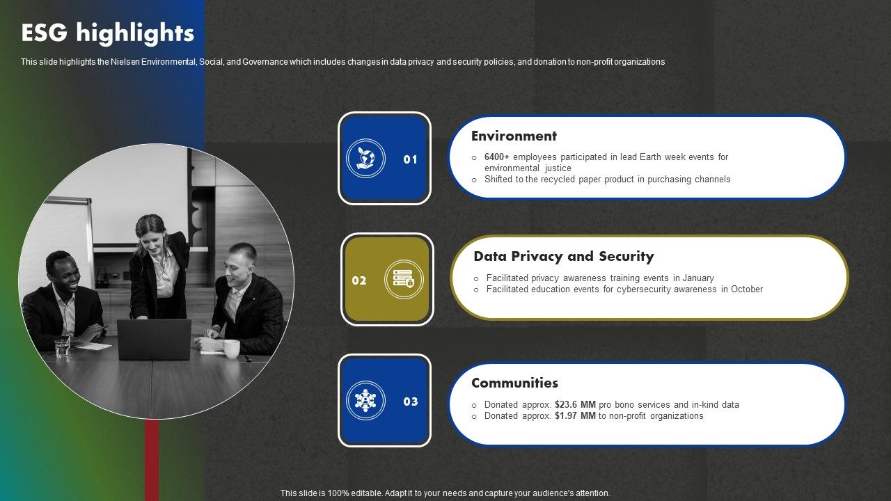 This slide highlights the Nielsen Environmental, Social, and Governance which includes changes in data privacy and security policies, and donation to non-profit organizations Want to ace your presentation in front of a live audience Our Data And Customer Analysis Company Outline ESG Highlights Structure PDF can help you do that by engaging all the users towards you. Slidegeeks experts have put their efforts and expertise into creating these impeccable powerpoint presentations so that you can communicate your ideas clearly. Moreover, all the templates are customizable, and easy to edit and downloadable. Use these for both personal and commercial use.