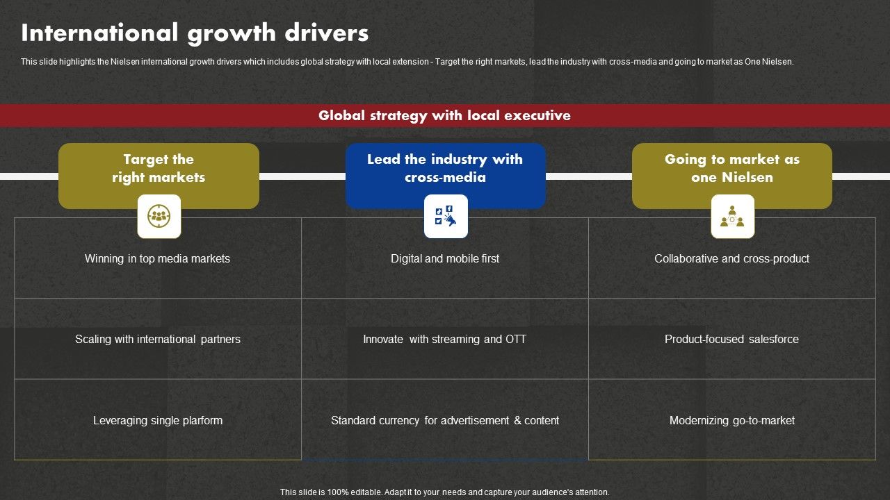 This slide highlights the Nielsen international growth drivers which includes global strategy with local extension Target the right markets, lead the industry with cross-media and going to market as One Nielsen. This Data And Customer Analysis Company Outline International Growth Drivers Download PDF is perfect for any presentation, be it in front of clients or colleagues. It is a versatile and stylish solution for organizing your meetings. The Data And Customer Analysis Company Outline International Growth Drivers Download PDF features a modern design for your presentation meetings. The adjustable and customizable slides provide unlimited possibilities for acing up your presentation. Slidegeeks has done all the homework before launching the product for you. So, do not wait, grab the presentation templates today