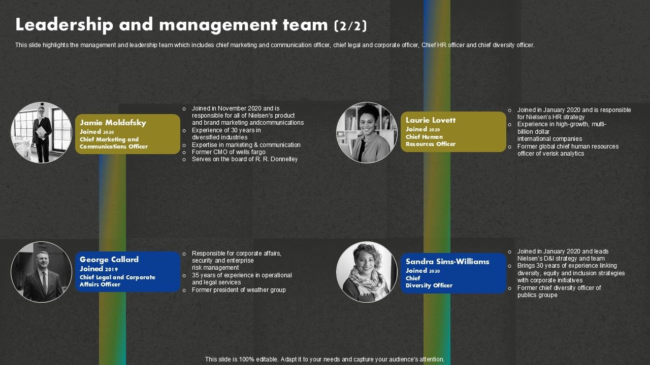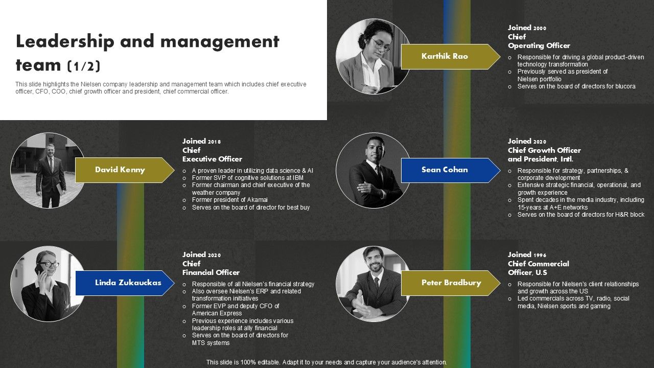 This slide highlights the Nielsen company leadership and management team which includes chief executive officer, CFO, COO, chief growth officer and president, chief commercial officer. Do you have to make sure that everyone on your team knows about any specific topic I yes, then you should give Data And Customer Analysis Company Outline Leadership And Management Team Brochure PDF a try. Our experts have put a lot of knowledge and effort into creating this impeccable Data And Customer Analysis Company Outline Leadership And Management Team Brochure PDF. You can use this template for your upcoming presentations, as the slides are perfect to represent even the tiniest detail. You can download these templates from the Slidegeeks website and these are easy to edit. So grab these today.