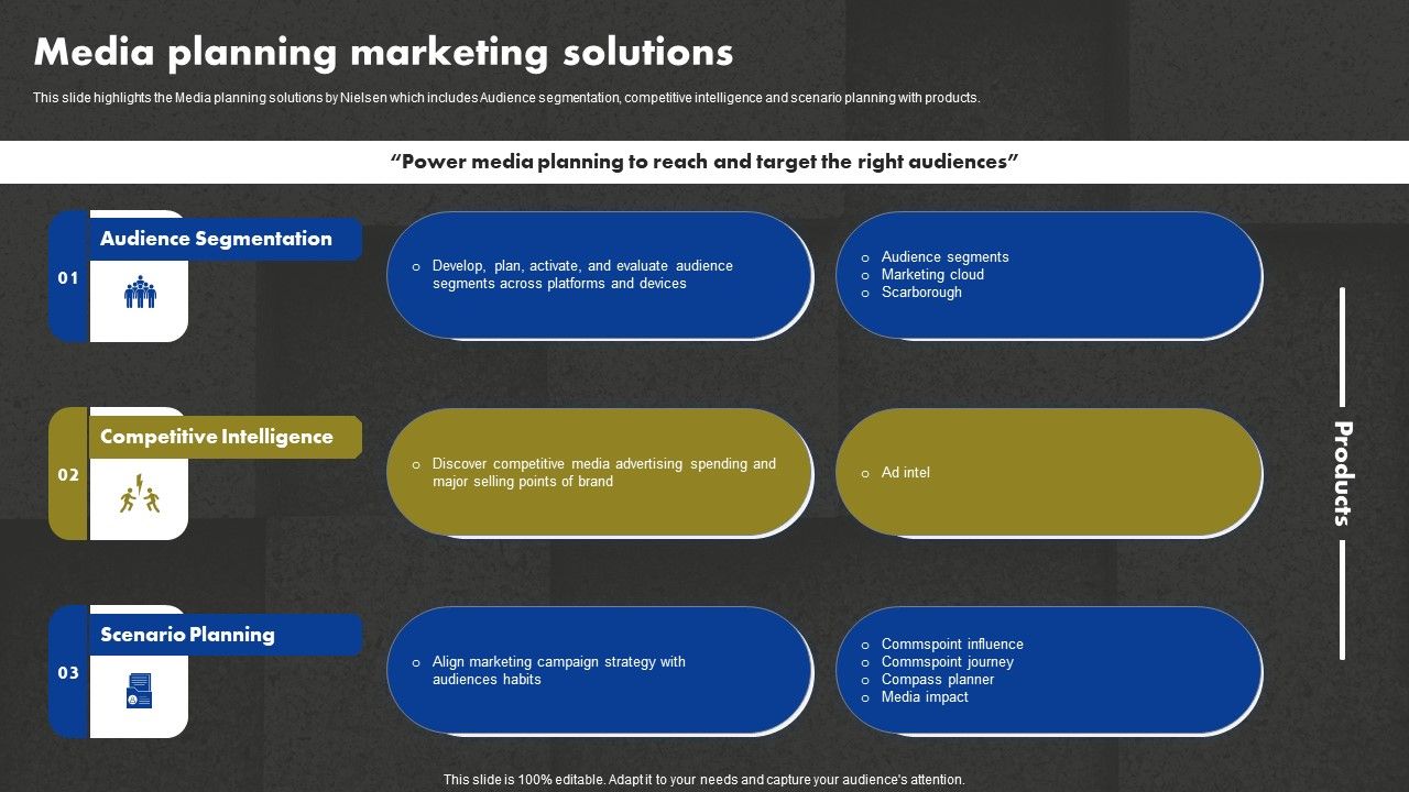 This slide highlights the Media planning solutions by Nielsen which includes Audience segmentation, competitive intelligence and scenario planning with products. The best PPT templates are a great way to save time, energy, and resources. Slidegeeks have 100 percent editable powerpoint slides making them incredibly versatile. With these quality presentation templates, you can create a captivating and memorable presentation by combining visually appealing slides and effectively communicating your message. Download Data And Customer Analysis Company Outline Media Planning Marketing Solutions Demonstration PDF from Slidegeeks and deliver a wonderful presentation.